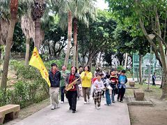 Sur le chemin du parc en chantant « Falun Dafa