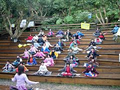 Après le déjeuner le premier jour, les jeunes pratiquants semblaient un petit peu inorganisés. Certains dormaient, mangeaient, parlaient et jouaient. Ils n’écoutaient pas vraiment les conférences. Remarquant cela, les pratiquants adultes ont arrêté la vidéo et parlé avec les jeunes pratiquants de l’importance d’étudier la Loi. L’environnement est redevenu progressivement harmonieux à mesure que les enfants s’assagissaient.