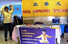 Un couple de gens âgés est venu au kiosque de Falun Dafa. Ils ont été impressionnés de la tranquillité du Falun Dafa. Au début, ils ont voulu acheter le rapport d'enquête sur les crimes du PCC qui prélève les organes sur les personnes vivantes. Quand ils ont obtenu une copie gratuite, la femme l'a mise devant sa poitrine en disant qu'ils feraient connaitre à davantage de leurs amis et collègues que le parti communiste chinois assassine les pratiquants du Falun Gong.