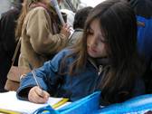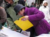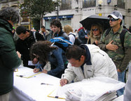 | Une femme tout en signant la pétition utilise sa main pour protéger le cahier de la pluie. |