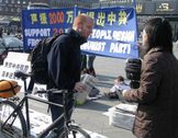 Un gentleman danois à bicyclette s’est arrêté en voyant la scène et a commencé à regarder attentivement les photos. Après avoir accepté une copie des «Neuf commentaires » en anglais, il a dit qu’il y a cinq ans, il avait personnellement pris part à un défilé à Hong Kong avec les citoyens de Hong Kong pour protester contre la pernicieuse loi de l’ « Article 23 ». Comment la conscience de la démocratie s’était si rapidement éveillée parmi la population de Hong Kong, même dans les circonstances où leurs propres droits étaient menacés, lui avait laissé une profonde impression. Il a dit que dans le monde occidental, bien que certaines figures politiques continuent à tenir leurs positions indifférentes envers la violence du PCC pour des raisons de profits économiques à court terme, la menace du PCC pour la paix dans le monde est de plus en plus reconnue. Par exemple, , la politique agressive et prédatrice envers l’environnement contraste vivement avec le grand respect pour la nature et l’adoption de toutes sortes de moyens pour protéger l’environnement au Danemark. En faisant ainsi, le PCC a aussi menacé l’environnement du monde. Toutes ces choses concourent graduellement à une prise de conscience des mensonges du PCC dans la société occidentale.