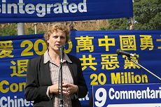 Mme Tracy DeGeer, au nom de la « Fédération pour la Paix Universelle » a fait un discours lors du rassemblement. Elle a déclaré que la paix et les mouvements de résistance non violente sont la résistance la plus puissance face à la tyrannie du Parti communiste chinois. Aucune force ne peut changer ni réprimer l’esprit des gens lorsqu’ils sont clairs et libres.