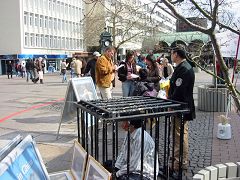 Une vieille dame est venue au stand avec des larmes sur les joues et a dit qu’elle ne pouvait pas supporter de voir ça, une pratiquante de Falun Gong rejouant la scène d’être torturée (une pratiquante de Falun Gong était attachée et en cage, un garde en uniforme à côté d’elle) derrière le stand, une banderole révélait les faits des prélèvements d’organes. Elle a dit que c’était inhumain et lui rappelait la 11ème guerre mondiale, dont elle avait eu l’expérience étant jeune.
