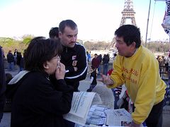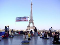Le 8 avril 2007, les pratiquants du Falun Gong ont tenu une activité sur la Place des Droits de l’Homme à Paris près de la Tour Eiffel protestant contre l'atrocité de prélèvement d’organes pratiquée par le Parti communiste chinois (PCC) sur des pratiquants de Falun Gong de leur vivant. Ils ont fait aussi la démonstration des exercices du Falun Gong et l'énergie bienveillante et compatissante de la pratique a attiré des touristes venus des 4 coins du monde. Ceux-ci sont restés à regarder et jouir de l’atmosphère paisible et de la beauté de la scène. Quelques personnes ont même imité les mouvements des exercices.