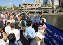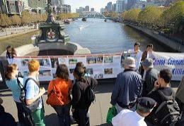 Le 25 avril 2007 était un jour spécial pour les Australiens, parce que c'était la journée du quatre-vingt-douzième « Corps d'armée de l'Australie et de la Nouvelle Zélande (ANZAC) ». On observe cette journée chaque année à la mémoire des soldats australien et néo-zélandais qui ont été blessés et tués pendant les deux guerres mondiales. Cette journée était également le huitième anniversaire du jour où dix mille pratiquants de Falun Gong de Chine continentale se sont rassemblés au bureau des appels près de Zhongnanhai, le quartier général du gouvernement central. Les pratiquants à Melbourne ont organisé une série d'activités pour montrer la qualité et la paix du Falun Gong aux touristes et aux citoyens qui ont participé aux activités commémoratives de la journée de l'ANZAC. Les gens ont été choqués par la persécution brutale que les pratiquants de Falun Gong ont subie en Chine. Les exploits réalisés par les pratiquants de Falun Gong pour contrer la persécution au cours de ces huit dernières années de difficultés et de tribulations ont touché les gens de ce monde.