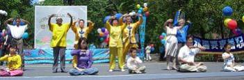 Les deux animateurs de la fête ont présenté l'histoire et le contexte du Falun Gong et la Journée du Falun Dafa en chinois et en anglais et ils ont invité le public à apprécier le spectacle des pratiquants.