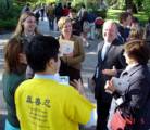 Un couple a demandé où ils pourraient apprendre le Falun Gong. Une dame a demandé si elle pourrait apprendre les exercices dans la ville. Un homme était très désireux de savoir comment il pourrait avoir plus d'informations sur la persécution du Falun Gong, des pratiquants ont répondu à toutes les questions.