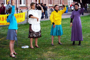 Des enfants plein de vie couraient tout autour excités, et il y avait toujours quelques enfants derrière les pratiquants de Falun Gong en train de faire la démonstration des exercices et qui imitaient leurs mouvements.