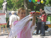 Les passants ont pu voir non seulement les cinq séries d’exercices du Falun Gong mais aussi une représentation de danse accompagnée de musique chinoise traditionnelle. Beaucoup de passants se sont arrêtés et ont admiré les jolis costumes et les mouvements lents des danseuses. Des ballons de toutes les couleurs ont été distribués aux aux enfants et même à quelques adultes.