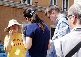 Un monsieur chinois âgé a demandé plus d'information aux pratiquants. Il a dit qu'il avait déjà lu "Neuf Commentaires sur le Parti communiste" et aimerait lire autre chose. Un italien a dit qu'il croyait que l'attitude envers "Vérité, Compassion, Tolérance" et le pervers Parti communiste chinois pouvait déterminer l'avenir de quelqu'un. Il a dit qu'il ferait savoir cette vérité aux gens qu'ils connaissaient.