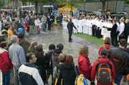 À 12h30, la chorale "Venus pour vous" a marqué le début du rassemblement. Des représentants de la Société internationale pour les Droits de l'Homme allemande, l'Association de Falun Dafa européenne, et le groupe de droits de l''homme Société pour les personnes menacées ont alors fait des déclarations au rassemblement. M. Zhang Zhentong de Leipzig a aussi décrit comment sa femme Wang Xiaoyan avait fait l'expérience des camps de travaux en Chine, parce qu'elle pratiquait le Falun Gong.