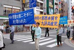Les supporters ont fait un défilé de deux heures à travers Ikebujuro et Shinjuku-ku. Le défilé a démarré à Ikebukuro et s’est terminé à Takabanobaba avec un groupe de tambourins à la ceinture menant le défilé et une troupe de danse des fées à la fin du défilé. Beaucoup d'habitants locaux se sont arrêtés pour regarder. Quelques touristes chinois ont été heureux de voir une condamnation au grand jour du PCC, et quelques-uns ont même démissionné sur place.