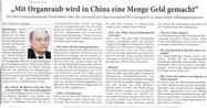 Le 5 avril 2007, le quotidien “Rhein-Neckar-Zeitung”, Baden Würtemberg, Allemagne a publié un reportage spécial sur le prélèvement systématique des organes de pratiquants de Falun Gong vivants sous l’autorité du régime communiste chinois, sous le gros titre « La récolte d’organes est lucrative en Chine. »