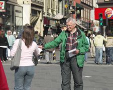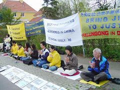 Cela fait cinq ans qu’avec d’autres pratiquants il a commencé à manifester devant l’Ambassade de Chine. Ils y vont chaque jour, qu’il pleuve ou qu’il vente. D’innombrables personnes prédestinées sont passés près de lui. Ils ont regardé et lu les posters ou accepté du matériel de clarification.
