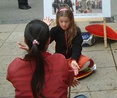 Une petite fille d’environ cinq ou six ans a vu les pratiquants faire les exercices et elle a couru vers eux et a appris les exercices. Elle est restée imperturbable en dépit du bruit ambiant. Elle a fait les cinq exercices calmement et sa mère qui l’observait tranquillement a pris quelques photos. Quand la mère a appris qu’il y avait des séances d’exercices tous les jeudis elle a dit qu’elle y amènerait sa fille.