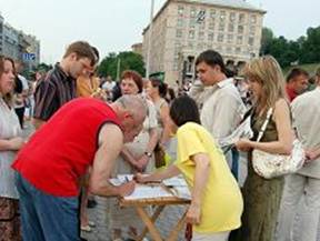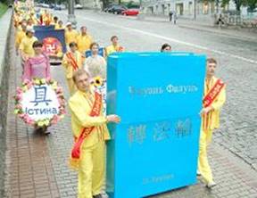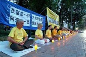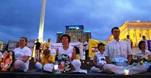 Les pratiquants ont aussi tenu une veillée aux chandelles devant l'Ambassade chinoise pour protester contre les huit longues années de persécution par le Parti communiste chinois et commémorer les pratiquants de Chine continentale qui ont perdu la vie. Dans le centre de Kiev, ils ont fait des démonstrations des exercices et dénoncé la persécution beaucoup de gens ont été touchés et ont signé les pétitions exprimant leur indignation envers la persécution du Falun Gong par le PCC.