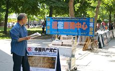 Une famille d’Anhui, en Chine, est tombée sur des pratiquants et a commencé à bavarder avec eux. Le père a dit :" C'est vraiment bien de vivre dans un pays libre. Je ne comprenais pas pourquoi le gouvernement chinois persécute une pratique si paisible. Je lis Epoch Times (La Grande Epoque) chaque jour à Toronto, et j'en ai compris la raison." Un jeune pratiquant lui a remis une copie des Neuf Commentaires sur le Parti communiste . Il a dit n'être pas membre du CCP mais il a demandé aux pratiquants de l'aider lui et sa femme à quitter les Jeunesses communistes.
