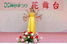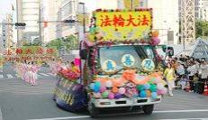 Le char du Falun Gong décoré et les fées célestes dansant à la Parade de Kobe