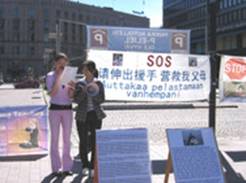 On pouvait lire sur une banderole un message écrit à la fois en chinois et en finlandais : "S'il vous plaît, tendez nous la main, aidez à secourir mes parents." C'était l'appel de Sunny au gouvernement finlandais et à la population locale. Elle a dit que ses membres de famille en Chine n'ont pas vu sa mère Chen Man depuis qu'elle a été kidnappée le 8 juin alors qu'elle tentait de secourir son mari Zhang Weijie. Mais malgré que le Bureau 6-10 n'ai pas nié qu'ils l'avaient kidnappée, ils ont refusé de donner à cela la moindre raison et de laisser les membres de sa famille lui rendre visite. "Ma grand-mère âgée et malade a perdu les soins de ma mère, mais elle du de plus se rendre partout pour chercher ma mère. Je suis séparée d'eux par les mers et les océans, et je ne peux pas directement porter secours à mes parents, m'occuper de ma grand-mère et la réconforter. J'appelle ici le gouvernement et le peuple finlandais à offrir leur aide, exercer une pression sur le Parti communiste chinois, afin qu'ils respectent les droits de l'homme, mettent fin à la persécution, relâchent mes parents et les milliers de pratiquants de Falun Gong qu'ils détiennent."