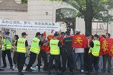 Lorsque la délégation du PCC est sortie, le groupe de manifestants s'est précipité devant les pratiquants de Falun Gong pour bloquer les pratiquants et leurs banderoles. La police s'est immédiatement interposée, attrapant la banderole rouge sang et repoussant les personnes qui sont retournées agiter leurs drapeaux à leur position d'origine. Les pratiquants ont continué à lever solennellement leurs bannières.