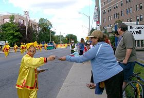 Les pratiquants de Falun Gong ont dit qu'ils ont participé à deux défilés, un à EastYork et un à Scarborough. La présentation des tambours de taille, la danse des Jeunes filles célestes et la démonstration des exercices ont été chaleureusement accueillies par les spectateurs. « Chaque année, nous sommes toujours occupés pendant la fête nationale du Canada », a ajouté un pratiquant.
