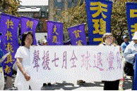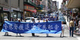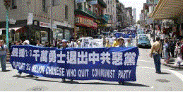 Des gens de tous horizons dans la région de la Baie ont défilé dans les rues principales de San Francisco le 14 juillet 2007, soutenant les 23 millions de Chinois qui ont démissionné du Parti communiste chinois (PCC). Après le défilé, les participants se sont rassemblés à Garden Park dans Chinatown pour promouvoir le « Mois des démissions du PCC », initié par le Service international pour démissionner du PCC. Les orateurs ont appelé les habitants à reconnaître la nature perverse du PCC et à démissionner du Parti pour leur sauvegarde.