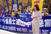 Mme Zheng de San Francisco a dit que le Falun Gong est persécuté depuis huit ans et que pendant tout ce temps, les pratiquants ont continué à sauver les gens. Elle a raconté comment, en 2002, on avait trouvé une pierre géante dans la province du Guizhou en Chine sur laquelle était écrit en caractères chinois « le Parti communiste chinois va mourir ». Des experts ont établi que cette pierre avait été formée il y a 200 millions d'années. C'est un présage pour que les gens sachent que le PCC sera dissout. Les pratiquants de Falun Gong promeuvent les démissions du PCC et de ses organismes affiliés pour sauver la vie des gens.