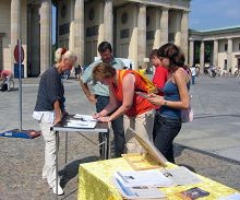 Cet endroit, en plein centre de Berlin à la Porte Brandebourg qui séparait auparavant Berlin Est de Berlin Ouest, est un site touristique très populaire. Beaucoup de touristes viennent le visiter et parmi eux, il y a de nombreux chinois aussi. La plupart des touristes acceptent les dépliants. Certains regardent aussi nos panneaux d'information. Ici, l'importance d'avoir des pratiquants parlant anglais prend toute sa signification. Nous avions également parmi nous des pratiquants parlant espagnol.