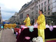 À la suite de la conférence de presse, il y a eu un défilé dans le centre de Londres. Le défilé incluait des banderoles conviant des bannières, de la musique, des joueurs de tambours de taille en costumes traditionnels, et de nombreuses pratiquantes vêtues de blanc tenant entre leurs mains des photos ornées de fleurs, de pratiquants de Falun Gong qui ont été tués dans la persécution. La fin du défilé incluait un char, des pancartes et des banderoles dénonçant les atrocités commises par le PCC et le prélèvement d’organes sur les prisonniers de conscience du Falun Gong. Des hauts parleurs appelaient au soutien les milliers de spectateurs. Le défilé parti de l’Ambassade chinoise est passée par Regent street pour s’achever à Trafalgar Square.