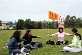 En voyant certaines personnes pratiquer le Falun Gong, une guide touristique Suédoise était très contente. Elle a dit qu’elle et sa fille voulaient apprendre également la pratique. Elle a alors noté l’adresse du point de pratique local et a dit haute voix au groupe qu’elle accompagnait : "Nous ferions mieux de nous dépêcher d’effectuer notre visite et ainsi nous reviendrons regarder le Falun Gong."