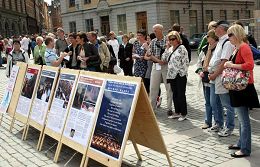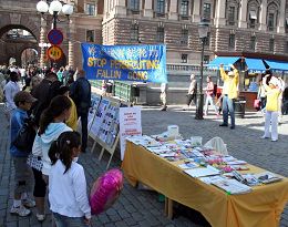 Entre le 28 et le 29 juillet 2007, alors que la compétition battait son plein, une banderole avec les mots « Arrêtez de persécuter le Falun Gong » a été suspendue sur la place en plein centre de Stockholm. En plus des panneaux d’informations présentant le Falun Gong et sa popularité à travers le monde et exposant la persécution du Falun Gong par le régime communiste chinois ont été mis en place. En même temps des pratiquants ont distribué des une information en différentes langues aux visiteurs venus de différentes régions du monde pendant que d’autres pratiquants faisaient la démonstration des cinq séries d’exercices du Falun Gong. La démonstration des exercices aux mouvements lents du Falun Gong au son d’une jolie musique chinoise et l'energie paisible dégagée par la pratique, ont attiré l’attention de nombreux visiteurs. Ils se sont arrêtés pour regarder la démonstration et ont demandé de plus amples informations sur la pratique. Les pratiquants ont patiemment discuté avec eux de sujets allant de la persécution du Falun Gong par le régime chinois, des prélèvements d’organes pratiqués sur des pratiquants de Falun Gong vivants dans des camps de travail, de la nature perverse intrinsèque du Parti communiste chinois (PCC) à la nécessité d’un mouvement des consciences pour demander la fin de la persécution. Les gens ont signé la pétition les uns après les autres pour condamner les atrocités commises par le régime communiste chinois.