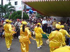 Une prestation spéciale a été donnée par les tambourins de ceinture à l'intention des personnalités. Une pratiquante a remis des matériaux d'information aux maires et aux autres fonctionnaires. L'animateur du défilé a présenté le Falun Gong aux spectateurs.