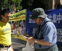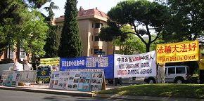 La bannière d'un beau jaune d'or avec le message "Falun Dafa est bon" scintillant au soleil et contrastant avec le bleu intense de celle où on lisait "Condamner fortement le génocide des pratiquants de Falun Gong par le PCC dans les camps de concentration, la collecte d'organes pour le profit et la crémation des corps pour éliminer les preuves," faisait grosse impression. Le 20 juillet 1999, le chef du PCC, Jiang Zemin, a lancé le génocide d'innocents pratiquants de Falun Gong, jaloux de la popularité de la pratique. La cruauté des méthodes de torture employées a été sans précédant. Huit ans plus tard, Jiang a été accusé des crimes de torture, de génocide, et crimes contre l'humanité dans une dizaine de pays du monde.