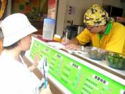 Un jeune homme dans un stand de jus signe pour soutenir les 24 millions