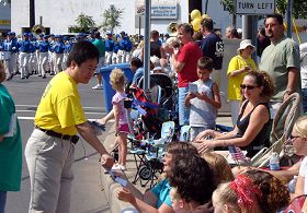 La participation du Falun Gong se composait de la Fanfare de la terre divine et d’une section de présentation des exercices. Partout où la Fanfare passait, les spectateurs frappaient des mains avec la musique. Beaucoup de gens ont reçu des dépliants sur le Falun Gong et les ont lus attentivement. La section d'exercice a présenté les exercices tout au long du défilé. Lorsque le groupe est passé devant l’estrade du jury, l’hôte a non seulement présenté les principes du Falun Gong, « Authenticité Bienveillance Patience », mais a également souligné l'atmosphère paisible qui entourait le groupe du Falun Gong.