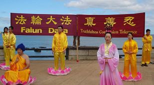 Sur le bord de mer, ils ont déployé leurs bannières "Falun Gong est bon !" "Authenticité, Compassion, Tolérance" et démontré les cinq séries d'exercices du Falun Gong. Ils ont aussi interprété une "Danse aux lotus" et une "danse à l'éventail" montrant leur affinité avec la culture traditionnelle chinoise.