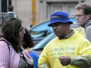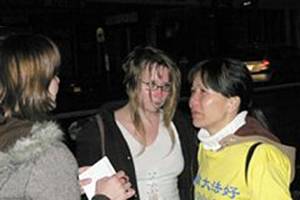 Les deux jeunes filles sur la gauche versent des larmes après avoir appris l'atrocité des prélèvements d'organes sur des pratiquants vivants par le PCC. Elles ont dit qu'elles aideraient les pratiquants à poster l'information clarifiant les faits.