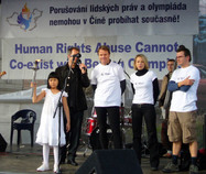 Dans l’information distribuée en anglais et en tchèque aux participants présents sur la Vieille Place, étaient citées les remarques du Président Havel : ‘’ Je soutiens le Relais de la Flamme des Droits de l’Homme car je le considère comme l’espoir du monde. La Chine a tenté de cacher ses violations des droits de l’homme en utilisant un gigantesque investissement de capital et une préparation colossale de projets pour les Jeux Olympiques. Le régime chinois a échoué à matérialiser ses promesses d’améliorer les droits de l’homme en Chine. Il est essentiel aujourd'hui d'amener la Chine à obéir à ses promesses.’’