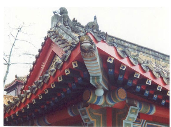 Les svastikas ornent le toit de ce temple bouddhiste à Hong Kong