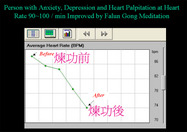 La figure 3 montre un pratiquant, après une année de pratique, qui a recouvré d’un rythme cardiaque irrégulier et de l’anxiété. Les battements du cœur d’un pratiquant sont passés de prés de 95 battements par minutes à un battement normal de 70 battements par minutes grâce à la pratique de Falun Dafa (Figure 4).