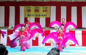 Ils ont fait des démonstrations des cinq séries d'exercices et interprété la danse traditionnelle à l'éventail et celle des "Fées célestes" pour montrer le monde serein de la "cultivation", et "Le Bouddha doré aux mille bras" exprimant la compassion et la solennité du Bouddha. Ils ont aussi chanté "Falun Dafa arrive dans le monde humain."