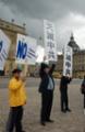 Des pratiquants portent des pancartes à bout de bras pour encourager les démissions du parti communiste