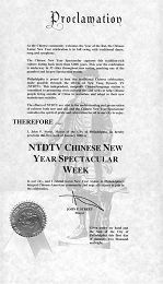 « Par conséquent, moi, John F. Street, maire de la ville de Philadelphie, proclame par la présente cette première semaine de janvier 2008 Semaine du Spectacle du Nouvel An chinois de NTDTV dans notre ville et je transmets des souhaits chaleureux de nouvel an à toute la communauté sino-américaine de Philadelphie et j’invite tous les citoyens à participer à cette fête. »