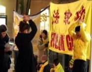La lueur des bougies et les torches allumées illuminaient les banderoles avec les mots "Falun Gong" et "Vérité, Compassion et Tolérance" dans l'obscurité. Au son de la paisible musique chinoise de style traditionnel, les pratiquants ont fait continuellement des démonstrations des exercices du Falun Gong malgré le vent froid , ce qui a attiré l'attention de tous les principaux médias présents avec leurs caméras et celle des invités au dîner. Les gens ont pris des photos les uns après les autres, regardant la scène et demandant davantage d'informations à propos du Falun Gong. Deux jeunes filles suédoises ont voulu apprendre les exercices sur le champ et de nombreux passants ont demandé des imprimés d'information.