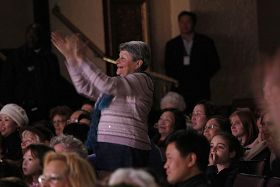 Elynna, une habituée du Beacon Theater, donne une ovation à la chanson de Guan.