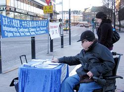 Selon Wang, un autre pratiquant « quand elle a vu un handicapé finnois dans son fauteuil roulant venir de sa propre initiative signer la pétition pour nous soutenir, une femme près de lui a demandé : ‘Qu’est ce que c’est ?’ La personne handicapée lui a expliqué : ‘C’est le Falun Gong, un groupe de personnes qui a sa propre croyance mais qui est persécuté par le gouvernement chinois comme les Juifs qui ont été massacrés par Hitler pendant la 2ème Guerre Mondiale.’ la dame a elle aussi signé la pétition. »