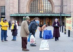 La Finlande a une population de plus de cinq millions d’habitants. La seule capitale d'Helsinki en compte environ 500 000. Il est rare que les gens se rassemblent. Depuis que les pratiquants du Falun Gong ont commencé leurs activités en 2000, ils ont utilisé toutes les occasions, les expositions, les parcs et les rues affairées pendant l’été - saison des voyageurs, les couloirs de métro, les gares, la gare centrale et les activités communautaires pendant l’hiver, inlassablement, afin de montrer à la population finnoise la sérénité et l'amélioration morale et physique qu’apporte le Falun Gong. En même temps, ils révèlent la vérité sur la persécution menée par Le Parti communiste chinois contre le Falun Gong en Chine continentale depuis le 20 juillet 1999. Avec un cœur de compassion, ils en appellent à la conscience et à la bienveillance, les appelant à aider à mettre fin à cette persécution absurde et inhumaine qui dure depuis huit ans.
