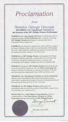 Il a été décidé, que moi, George Onorato, sénateur de l’état, j’offre mes félicitations à New Tang Dynasty Television et la Troupe des Arts Divins dès la première du Holiday Wonders 2007.