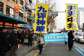 Zhong Xianxiu est Coréen et fait du bénévolat au Bureau mondial pour démissionner du PCC. Il est souvent allé devant le consulat chinois et a essayé de persuader les personnes à renoncer au PCC. Récemment il a aidé plus de 400 personnes à renoncer au PCC en un mois, Zheng Xuanshu qui aide aussi les personnes à renoncer au PCC devant le consulat chinois a dit : « Plus de 30 millions de personnes ont déjà renoncé au PCC et ont choisi un nouveau futur. Récemment en Corée, 3000 à 4000 chinois renoncent au PCC chaque mois à travers tous les bureaux de service dans le pays. De nombreux chinois utilisent même leur vrai nom sur leur déclaration pour renoncer au PCC. Cela veut dire que les chinois n’ont plus peur du PCC, J’espère que ceux qui n’ont pas encore renoncé au PCC se joindront bientôt à cette l’action mondiale. »