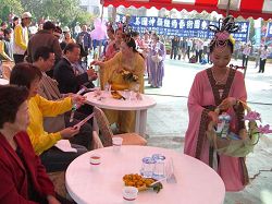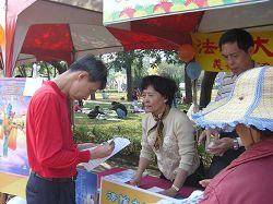 À cet événement, les fées célestes ont donné des marque-page avec un lotus et les mots « Falun Dafa est bon. » Elles ont aussi distribué de l’information au sujet du spectacle de la Compagnie des Arts divins à Taïwan. Wang et Yang Chou, dirigeants du comté de Kaohsiung ont accepté les dépliants et les marque-page. De nombreux visiteurs ont demandé des marque-page.